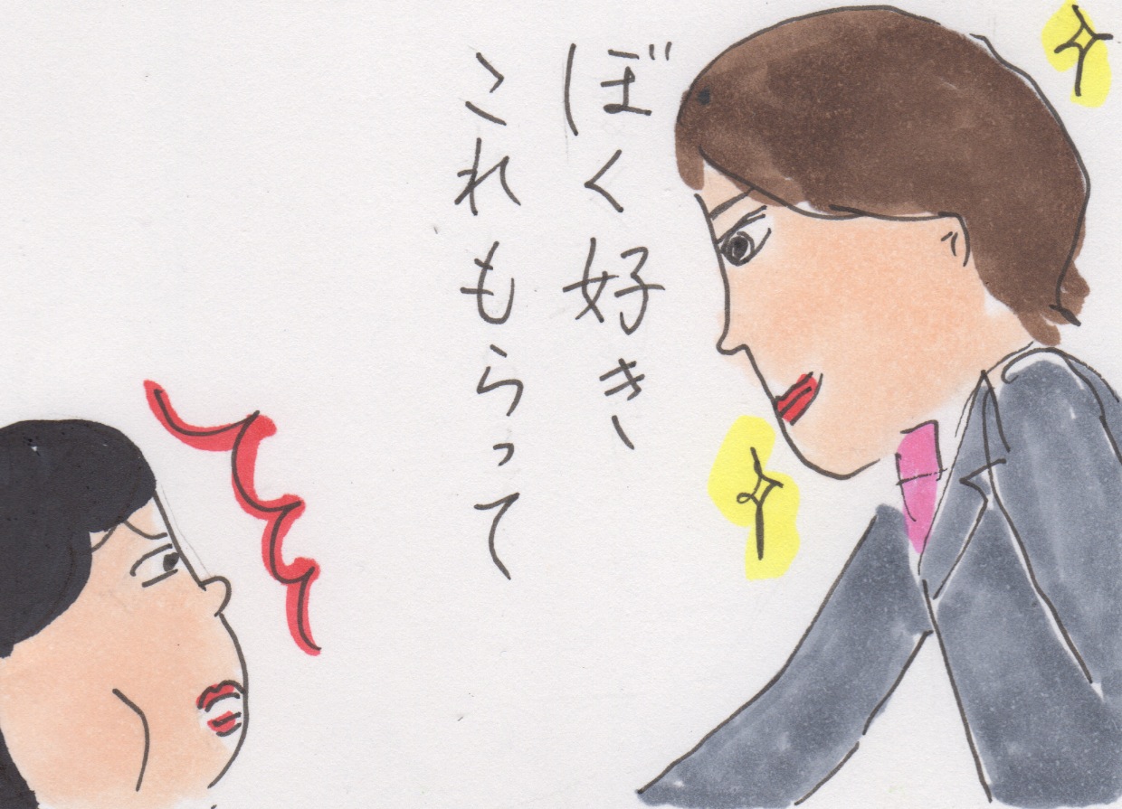 あれは、小5の夏休み。毎日朝、漫画を描いて母に見せていたのですね。5日目くらいで飽きてしまって、今日でこの連載は終わりにしようと、とりあえずは描いて、キッチンで水仕事をしていた母のところに持って行った。私が漫画を持って行くと、濡れた手をエプロンでササッと拭いて、その場に立ったまますぐに読んでくれたのですね。そして、今日も面白かったと言ってくれた。普段漫画なんか読まない母が、私の漫画を楽しみにしてる?(今思えば、付き合いだったと思うんだけど)すごく嬉しくて、そして、なんだか売れっ子漫画家先生にでもなったような誇らしい気持ちになり、母のためにも止めるわけにはいかない!と強く心に誓った。