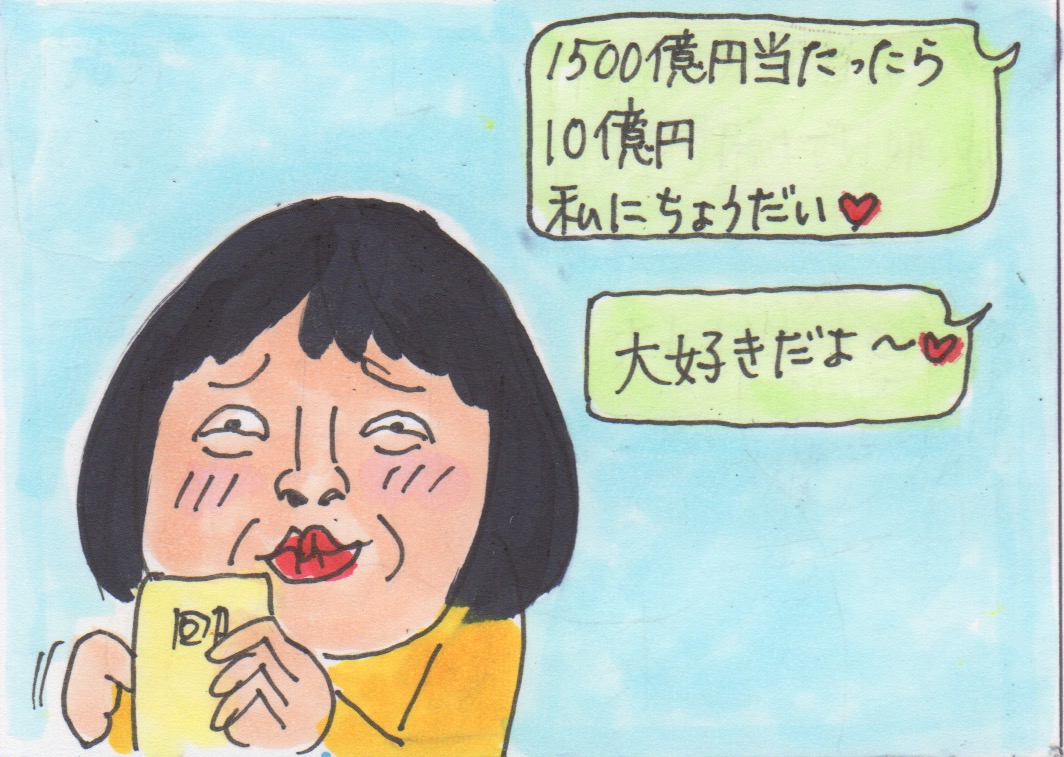 1億当たったら・・・10億当たったら・・・の妄想は楽しい。でも、1500億円当たったらの妄想は、もう多すぎちゃって(私には)現実味なく、あまり燃え上がらないのよ〜。だから、私、10億だけで十分だわ〜←えっ?