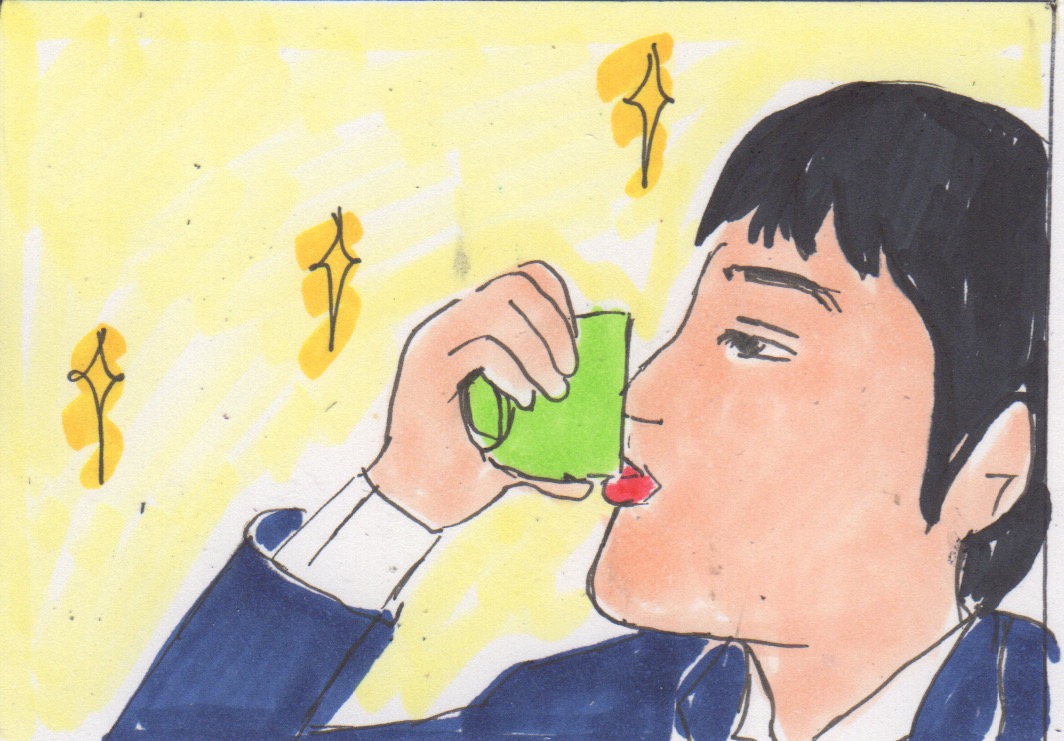 花瓶の水を湯のみに移して飲むシーン。