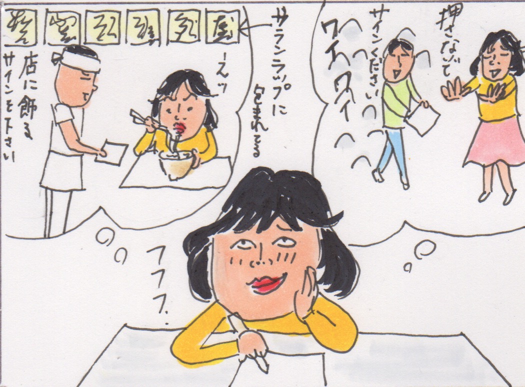 サインの練習、これ思春期に誰もが通る道だと思っていた私。あの頃は、自分のサインだけじゃない、アイドルのサインまで真似て、得意気になって書いたりしたものよ〜。当時、私はキョンキョン、聖子、としちゃん、藤谷美和子のサインなら、ゴーストライターになれる自信があったもの!(ヨッちゃんのサインは複雑で何となくしか書けなかった・・・)そういえば、今、アイドルのサイン、あまり見ないかも。テレビガイドのお正月特大号のレモンくらい?