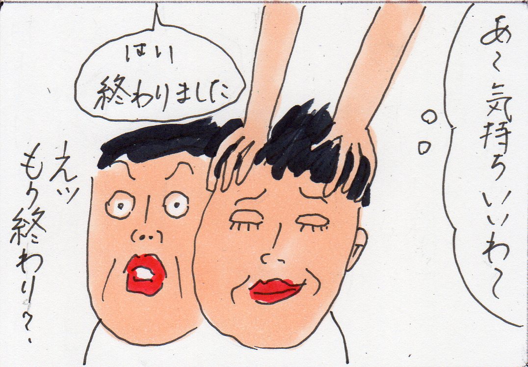 ヘッドスパの途中、「あっ、頭があったかい!」その記憶以外は何も覚えちゃいない。爆睡しすぎ! そして、朝、ベランダに出てたら、頭上からいきなり冷たいものが。見上げるとカラスが飛び立っていった。まさか!で、髪に手をやれば・・・そう頭の上にカラスのフンよ! うぐいすのフンならまだしも!カラスって! 臭いのなんの! 私のヘッドスパできれいになった髪になんでよ!
