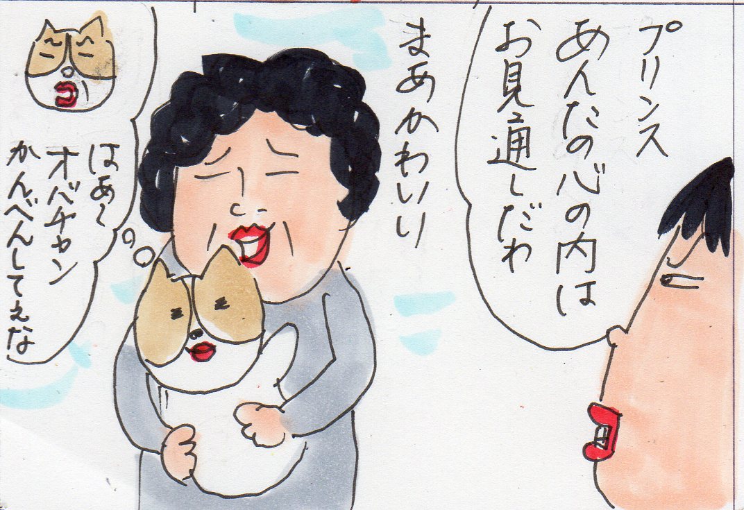 長女の言ってることもわからなくもない。昨日も散歩してて、若いお姉さんに可愛がられている時と、おばさんじゃとじゃ、明らかにプリンスの態度が違ったもの! おばさんの時など私にも見えた!『はよ、解放してくださいな』的なオーラが! って、それは考えすぎだろうか?
