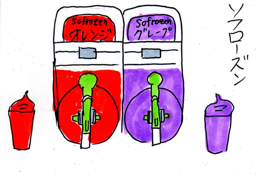 私はスラーピーって呼んでます。近所のセブンイレブンで、コーラ、ラムネ、グレープ、レモンの4種類をコーヒーと同じセルフスタイルで売ってます。