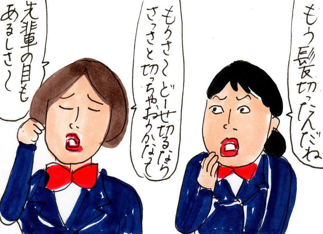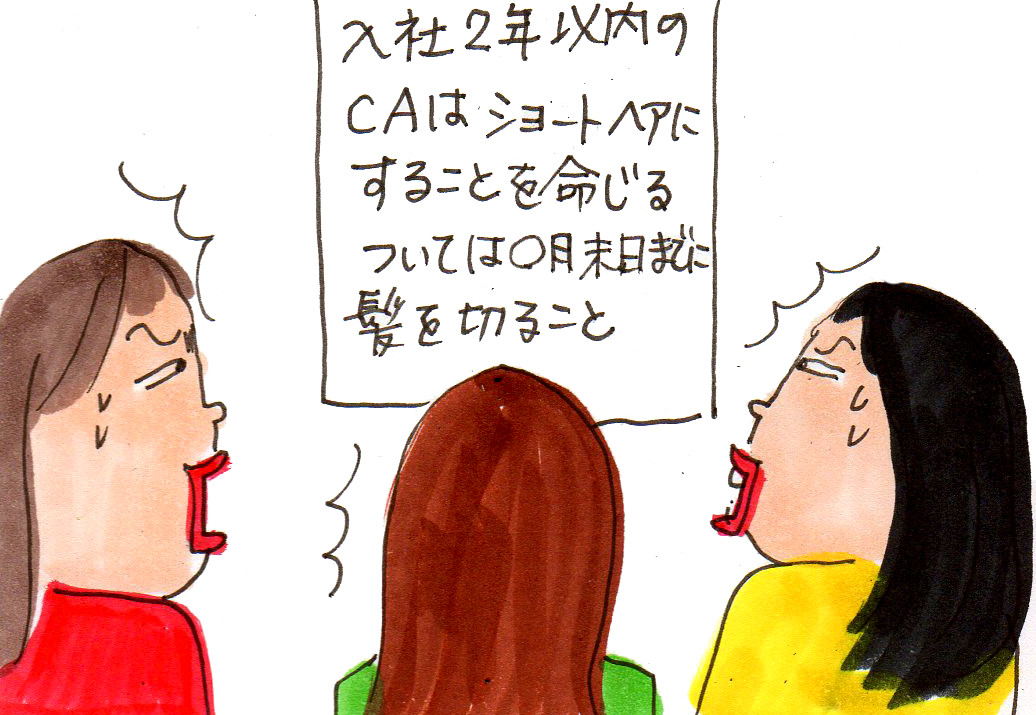 今回髪型についてだったのでコメントしてしまいましたが、お友達で以前海外の、航空会社でCAさんをしていた方がその方の会社では化粧も髪型も3種類あって、マネージャみたいな人があなたはコレ、あなたはコレって指名していくそうです(^_^;)それ以外の髪型及び化粧は認められなかったと聞いて戦いていましたが、CAさんの世界はどこもそういう感じなのでしょうかね?凄い世界だなぁ(°д°)