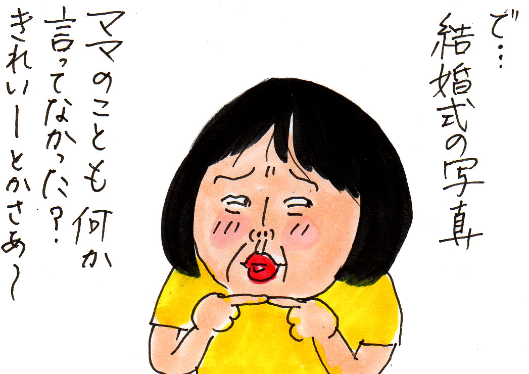その後、帰ってきた夫、なぜ急に長女に逃げられたのか知る由もなく。私は意地悪に詳細を話してあげましたよ。傷つくと思ったら、私の花嫁姿スルーされた話の方がツボだったようで、大爆笑。なんだか悔しい!