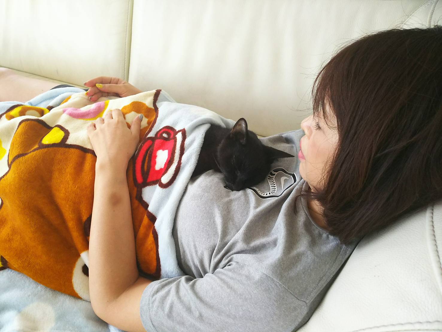 我が家の猫も元気がない家族に添い寝します。いつも私の後ばかりついて歩くのに…。