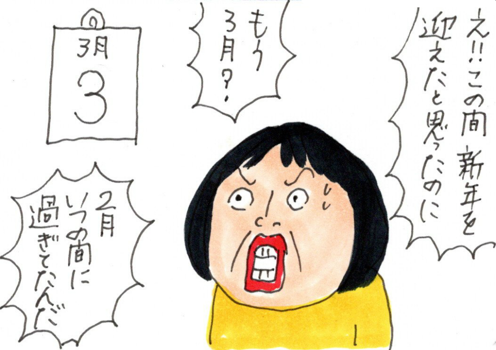 今年ほど1年があっという間に過ぎた年はなかった。暖かくて冬が来たという感じがしなかったから? それとも加齢によるものなのか? 若い時ね、失恋して失意の中、占いに行ったんですよ。そしたら、占い師が「2年後、素敵な出会いがありますよ」って。当時の私は「にィ・・・2年も先? 私の人生、真っ暗じゃん」ショックを受けたことを思い出すわ。あの頃の2年って、気が遠くなるほど先のことだったから。年々1年が早く感じる今なら、目を輝かせながら言える「えっ、2年後? 楽しみに待ちまーす」それだけ1年が自分の中で短いということ、気がついたらあっという間におばあちゃん、浦島太郎にならないように毎日を過ごしていかねば!