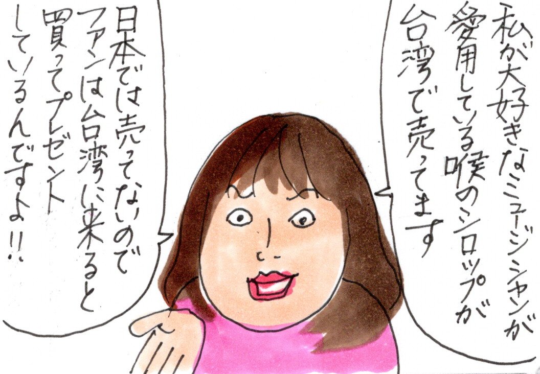 ビワシロップのことは、今回、台湾で初めて知りました。日本にはないのですね、あればいいのに。日中のフルアテンド、サービス満載で最後のほうはガラガラにさせてしまった、カータンの美声が、中森明菜みたくハスキーになっても(^^;)ちゃんと出ましたもん。