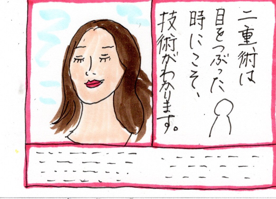 「目をつむった時こそ技術がわかります」の文字の横に、目をつむってる女性の写真だもん!勝手に「おぉ、これがその技術か!」と思ってしまいましたよ!偉そうに語ってしまったのは、性格の悪さからです。