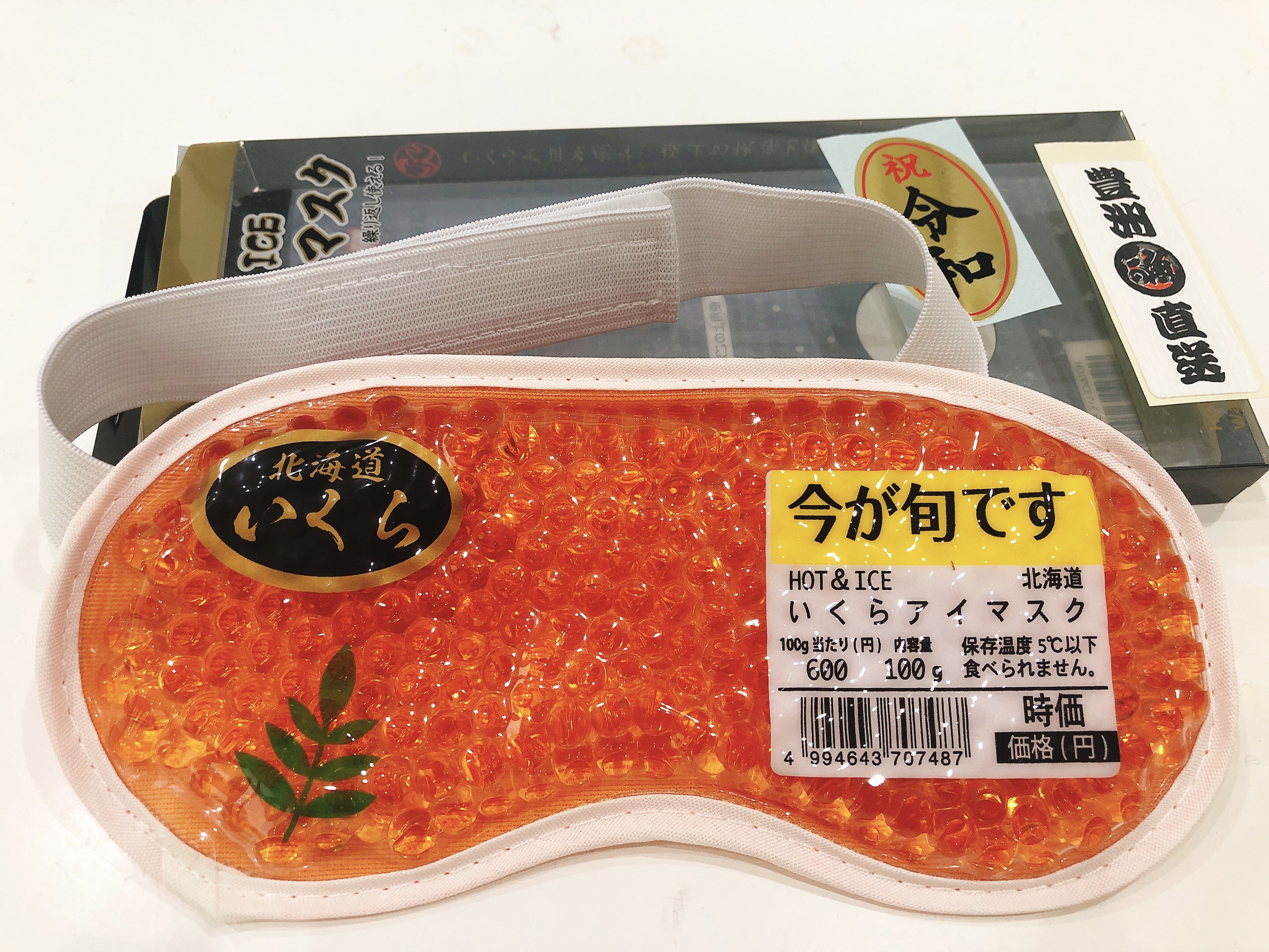 イクラのアイマスク、北海道の土産屋でも売られてました!違う友達から、面白いもの見つけたよ、ってそれぞれもらって、なぜかうちに2つ…。意外と使い心地もいいですよねー。