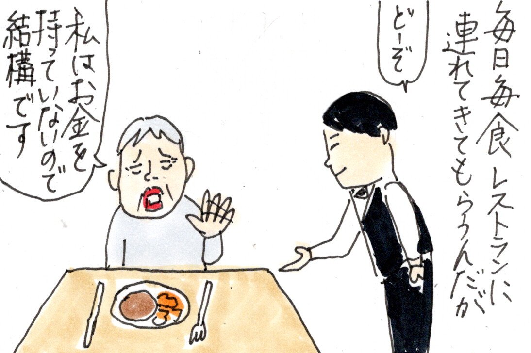 うちの父も配膳のとき「お金持ってないけど良いんですか?」と施設の人に聞いたり「わし、お金ないからちょっと置いていってくれ」とよく言ってました。それで「お金は先払いしてるから心配せんでいいよ」と説明するのも面会時のお約束でした。そして母は「○○(宗教団体)に閉じ込められてる」と言ったりしてたのです。