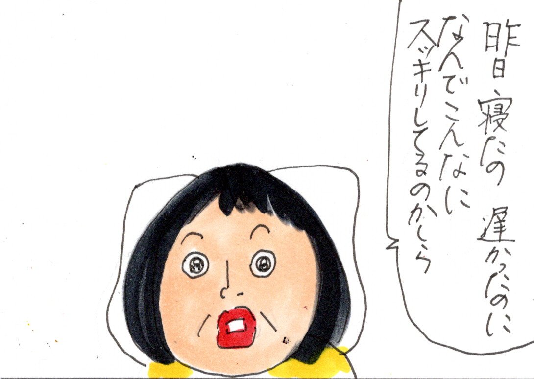 起きるタイミング 2021年06月28日 カテゴリ:ブログ 今朝のこと。10時間以上寝たくらいのスッキリ爽快な目覚め!何時だろうとスマホを見たらこのまま起きてしまおうか、でも・・・ そして、2時間後2時間、多く寝たはずなのに・・・あの時、起きていたら・・・起きるタイミングって大事。 □■□■□■□■□□■□■□■□■□□■□■□■□■□ あんな清々しい寝起きの2時間後に、地獄のような寝起きが待っていて・・・あの時、スクって起きていたらとめちゃくちゃ後悔した。 「ブログ」カテゴリの最新記事 < 前の記事次の記事 > コメント コメント一覧 (35) 35. KEIKO 2021年07月05日 20:37 私はここ数年、アラームの時間より前に必ず何度か目が覚めてしまいます。 別に尿意でとかじゃなく。 でも、皆さんのコメント見て、ちょっと安心しました。 若い頃は朝までグッスリだったのにな~ 0 カータン がしました 33. りりす 2021年06月30日 14:00 睡眠のリズムは90分きざみ(個人差あるのでしょうか?)と聞いたことがあります。 寝てから90分・180分・270分…のタイミングならすっきり起きられると。 だから、あと2時間…ではなく1時間半ならよかったかもです。 0 カータン がしました 32. さくら 2021年06月29日 23:20 あともう少し寝られる、って安心して寝てから起きた朝はたいてい寝起き悪くなりますよね笑 0 カータン がしました 31. お寿司 2021年06月29日 22:21 今日5時にスッキリ目が覚め、カータンの記事を見てまさに今の私〜!よしならば起きよう!!と瞬きした瞬間にアラームなりました。1まばたきで2時間過ぎてました‥ 0 カータン がしました 30. 目覚めわるこ 2021年06月29日 21:17 目覚めのお顔がとっても可愛い〜〜〜! こういうちょっとした表情の描き方が好きです。 0 カータン がしました 34. ビオゴン21 2021年07月03日 02:28 >>30 表情に関しては 本当にカータンの絵はどんなプロ漫画家より上手い、と思います 前にカラオケの話を読んだ時から思ってました(傑作です) 0 カータン がしました 29. ちろちゃん 2021年06月29日 15:43 すっきり目が覚め、時計を見たらまだ午前2時!なんてことありますよ〜〜。 私は起きてキッチンに行く時間は決まっているので(←あまり早く行くと家族にうるさいと言われるため…)その時間になるまで、布団の中で、スマホで色々調べたり、懸賞サイトに応募したりしてます。 0 カータン がしました 28. かっぱ 2021年06月29日 13:56 年取ると起きるの早くなるっていいますがほんとにそうですね 今は基本5時前後に目覚めてしまうので 二度寝せず静謐な朝を楽しんでいます 鳥の声とかたくさん聞こえるし夏なので明けてくる空もいい感じだしすごい価値を感じます 十代のころはどうしてあんなに寝ても寝ても眠られたんでしょうかね? 因みに早起きとお昼寝はワンセットです 0 カータン がしました 27. 同じ同じ! 2021年06月29日 12:47 私も最近全く同じ状況です!! まさにかーたんズル−ン——‼︎ミ (ᓀ 人ᓂ) 彡🐕🐍🐇🐘🐸🦅さんと同じように4時頃パチッと目が覚めて、二度寝したらもう寝起き最悪で… かと言って4時頃から起きてると午前中眠くなると言う… うまくいかないもんですよねぇ。笑 0 カータン がしました 26. Qちゃん 2021年06月29日 11:54 あるある! 二度寝三度寝は絶対眠くなるし、疲れた感じになりますよねー。 夜電気を消してもすぐに寝れないし、寝てから朝までに何度も、、、私は猫様に起こされます。 0 カータン がしました 25. みる 2021年06月29日 09:29 新聞屋さんのバイクの音のせいなのか? 夫がトイレに起きてるのか? 私も4時台に一度目が覚めます。もちろんまた寝ますが(笑)でも幼少期からずーっと朝に弱かった私が最近は6時前にスッと起きれます。歳のせいでしょうか?(笑) 0 カータン がしました 24. なまえがなしこ 2021年06月29日 06:24 超分かります。 私午前、2時起きで、くいっくるわいぱーをかけて、空が明るくなって来たら草取りして、朝寝とかしてます。 時間が自由なので、有効に使ってます。 夏至も過ぎてしまいました。 でも、まだまだ明るいので楽しみながら草取りや掃除ご飯。 そして疲れたら、午前中のうちに寝る。 今の私にあってる、時間の過ごし方です。 全く違う日もありますが。 自分に責任の取れる過ごし方を選ぶように、しております。 楽しいです。ありがとうございました😌 0 カータン がしました 23. ちょび 2021年06月29日 06:22 わかります!夜中目が覚めて、また寝ようと思ってもなかなか眠れず、スマホ見たりしてたらなかなか眠れません😂ようやく眠くなって寝ても起きたら目覚めは最悪😱そうか、90分間隔でアラームかければいいんですねー!私も年々朝起き上がるのが辛くなり、目覚めた瞬間立ち上がるとものすごい貧血が襲ってきて、半日は寝たきり状態になります💦なので起床予定の30分前に起きて足あげたりゴロゴロ寝返り打ったり頭に血が回るようにしてから起きてます!これだと貧血ならずに過ごせます! 0 カータン がしました 20. ゆめぴりか 2021年06月29日 01:04 睡眠の