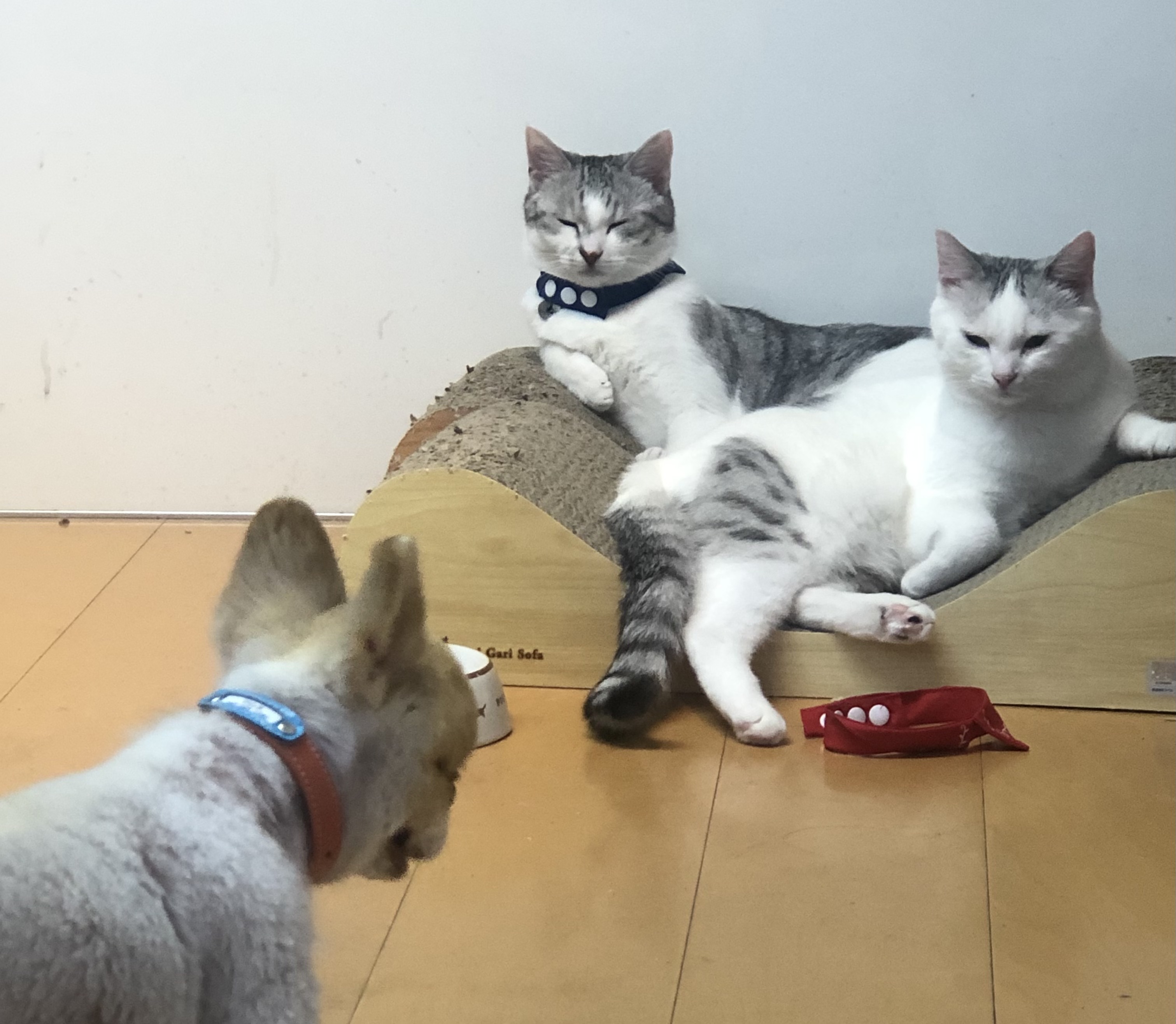 何て偉そうなんでしょ!2匹の圧に、タジタジのワンコが気の毒〜。