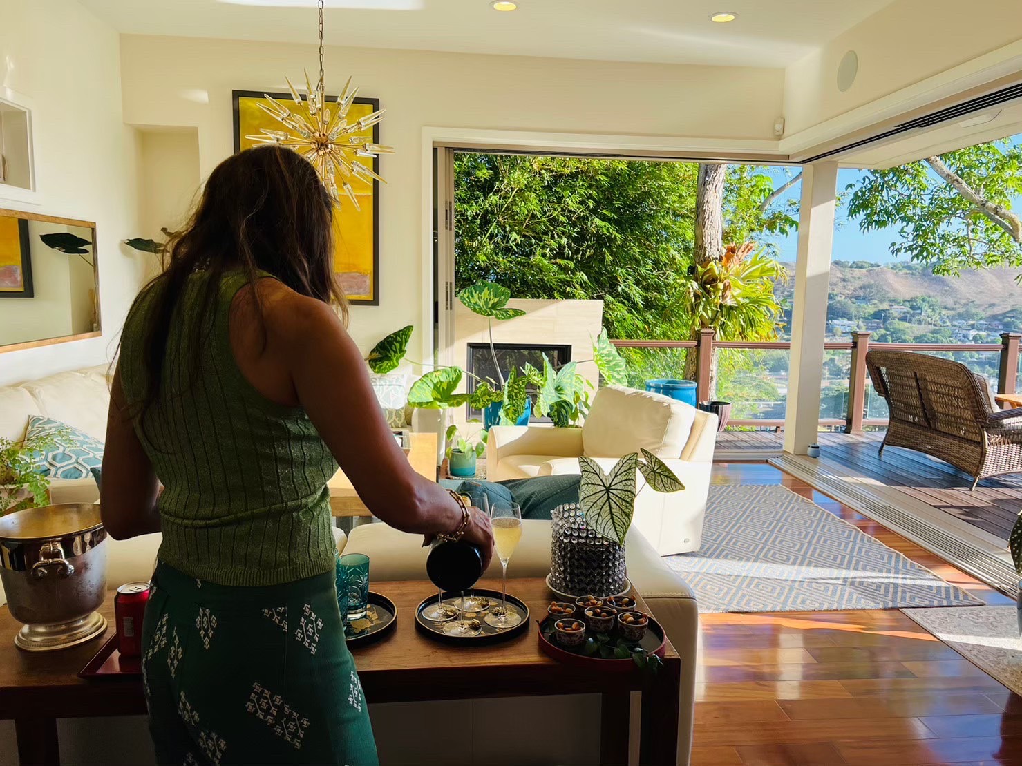明るい日中、ラナイで写真を撮る。