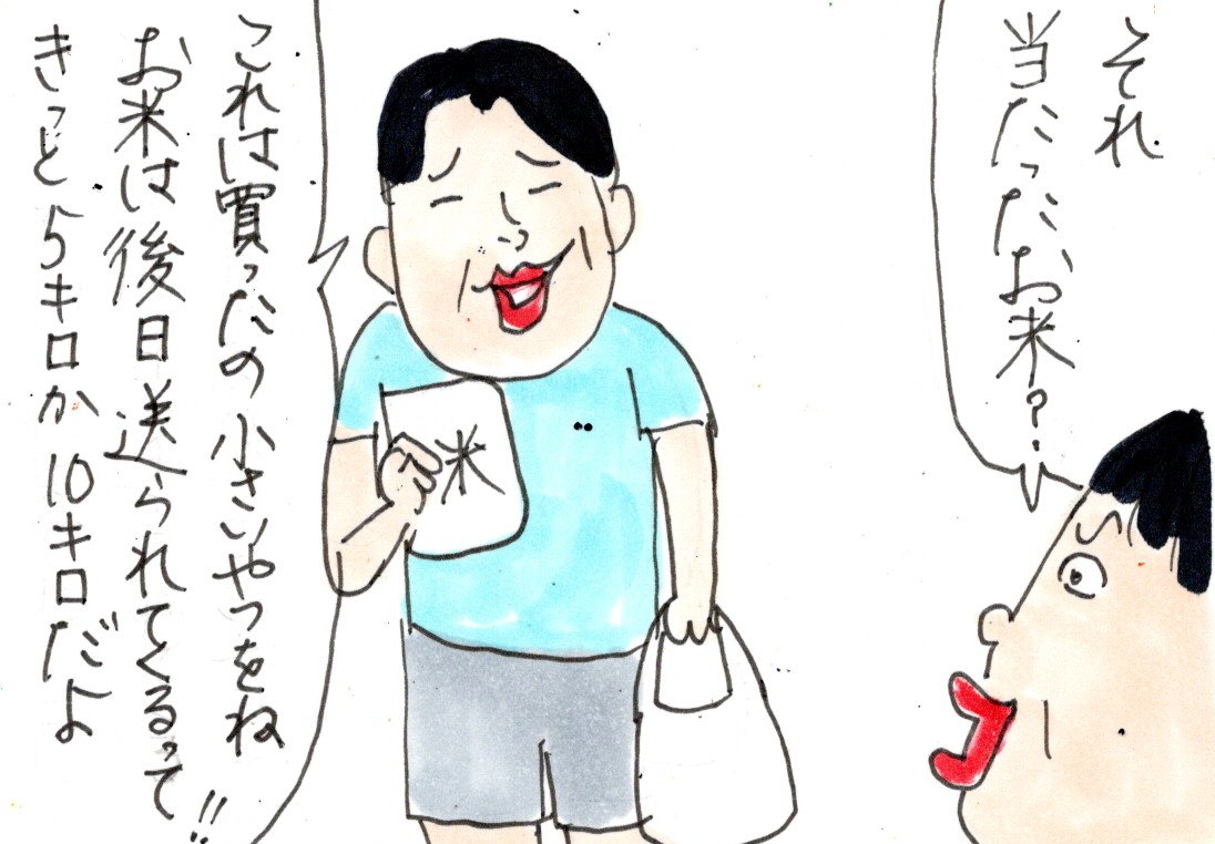 夫がお米が当たったと言うから 2023年10月03日 カテゴリ:家族夫 ちょうど買い物に出ていた夫に電話した。夫は2キロのお米を抱えて帰ってきた。ところが…2キロのお米が残り少なくなってもまだお米は送られて来なかった。そして、今日。待ちに待ったお米が届けられた。お米が届いたことを夫に伝えた。これ、サンプルって言わない?届いたお米。ピンで見るとわかりづらい?チョコと並べてみました。□■□■□■□■□□■□■□■□■□定型サイズの封筒を開けたら、まさかのお米! これが、夫が言っていた当たったお米だと理解するまで時間がかかった。これ、お米が当たったんじゃなくて、お米のサンプルが当たったんだよね? 「家族」カテゴリの最新記事 < 前の記事次の記事 > コメント コメント一覧 (60) 61. けいぴ 2023年10月13日 14:42 私もありました(笑) 佐渡に旅行に行きお祭りみたいなのでお米が当たった‼ 思いから帰りどうしよう~。 と心配したら同じ位の大きさでした(笑) 0 カータン がしました 58. きょん 2023年10月07日 09:51 まさかのポケットサイズ(笑)!? 並べて置かれたチョコの薄さに近くて笑えます! お米といえば、たまたまコンサート前に立ち寄った物産展のクジを引いた姉が2等を当てました。「おめでとうございまーす!」とその場ですぐに3キロのお米を手渡され「お米を抱えてコンサート行くの初めて!」と大笑いしました。 今の時代は個人情報目的の懸賞もあるから 気をつけないといけないですね… 0 カータン がしました 56. 2023年10月05日 21:47 住所書く前に聞けばよかったですね。 何キロのお米か。 そこで口を濁したら、私なら書かない、かな。 0 カータン がしました 54. しん 2023年10月05日 13:00 サンプル米と引き換えに、個人情報取られちゃったねぇ~ ピンポイントなDM増えませんように🍀🍀🍀 0 カータン がしました 51. うちは、かーたんちの300倍でした 2023年10月05日 02:04 うちは逆でした。笑 そろそろお米がなくなったので「お米買わなきゃ」と言ったら「俺が備蓄してるの出すわ」と。 災害非常時のため無洗米を小分けにして真空パックにしてる分のことだと思ってたけど、なかなか出してこない。 催促して出てきたのはなんと分厚い紙袋に入った30kgのコシヒカリの玄米! 「は?何これ?」 「玄米は日持ちするから買っといた。6年位経っても食べられるらしい」 どうも食料危機が来るというYouTuberに煽られて、去年私が実家の母の介護で帰っている間にこっそりと買ってたらしい。 (夫はそういうのに煽られがち) 普段白米と玄米をブレンドして食べてるので 「でも、結局白米いるじゃん」 「精米したらいいねん」 「え?精米してくれるところに持ってくってこと?」 そうしたら、おもむろに箱に入ったアイリスオーヤマの家庭精米機が・・・笑。 それで去年、防災備蓄を置いてる部屋にクーラーを取りつけると言ったのか・・・と腑に落ちました。 0 カータン がしました 55. お米は 2023年10月05日 14:31 >>51 長期間保管していると、虫が湧きやすいので要注意です コクゾウムシやチャタテムシなどが大発生して散々だったことがあります それ以来、お米の買い置きはなるべくしないように気を付けています💦 0 カータン がしました 57. うちは、かーたんちの300倍でした 2023年10月05日 21:55 >>55 そうなんですよ~ 以前にも夫が「小麦粉がなくなるらしいから多めに買っといたほうがいい」と言うので 「そんなん買いだめしても粉ダニが湧くやん」と拒否った私。(ちなみにうちは夫婦二人だけ) なので、私がいないうちに買ったようです。 「そんなんすぐには無くならへんし、もしもそうだとしてもそうなり始めた時に買えばいいやん」と言うと 「そうなり始めた時には遅いねん。情弱な人間はそうやねん」と。 結局、小麦粉も今も普通の値段で買えるし、食料危機にもなってないので「どっちが情弱やねん」ですΣ\( ̄ー ̄;) 言っても喧嘩になるだけなので、虫が湧いて痛い目に会えばわかるのかもと半ばあきらめています ̄\(-_-)/ ̄ 0 カータン がしました 50. ちまき 2023年10月04日 19:34 100gのお米って0.5合より少し多い(1合よりは少ない)んですね。そんなのもらっても、他のお米に混ぜて炊きますよね?味が分からない😵💧 やはり皆さんが言うように個人情報収集目的のような気がします。 0 カータン がしました 48. きき 2023年10月04日 18:01 そう言えば私の叔父は、帯が当たったんだよ!着物も割引きで買えるって!孫に丁度いいな! と喜んでいました。 とても喜んでいたので、それってナントカ商法では?と言えませんでした。 0 カータン がしました 46. ばなぼん 2023年10月04日 17:05 100グラムのお米って!サンプルにしても使い勝手悪すぎて、むしろイメージ悪くなっちゃう(逆恨み?言いがかり?💦) 0 カータン がしました 45. カズカズ 2023年10月04日 14:13 お米と言えば 亡き父の甥っ子一家が 新潟で 兼業農家やってるんだけど 亡き母が 元気だった頃 30キロ茶色い米袋で 送ってもらっていた 一万円で まあ 美味しかったんだけど 