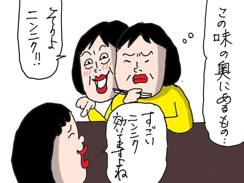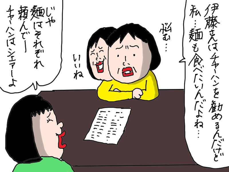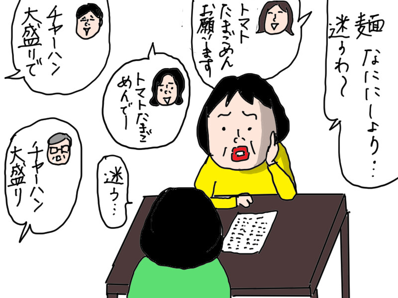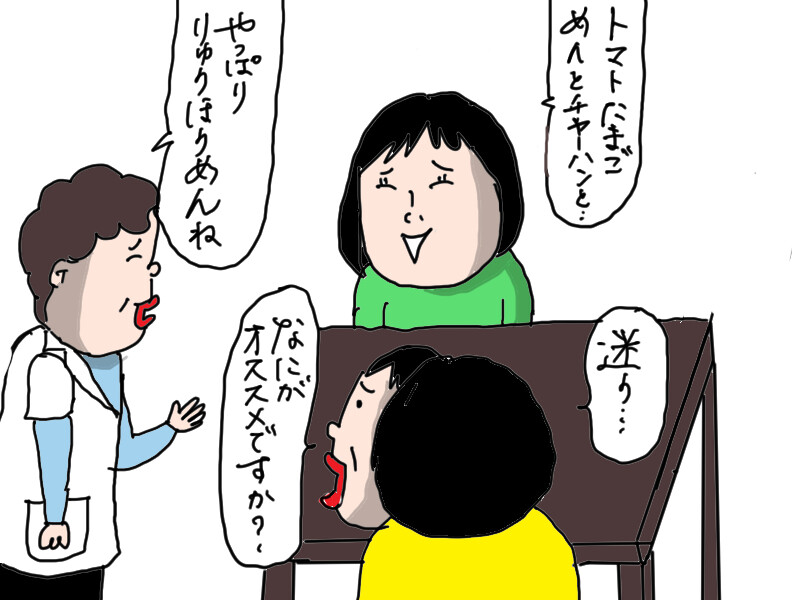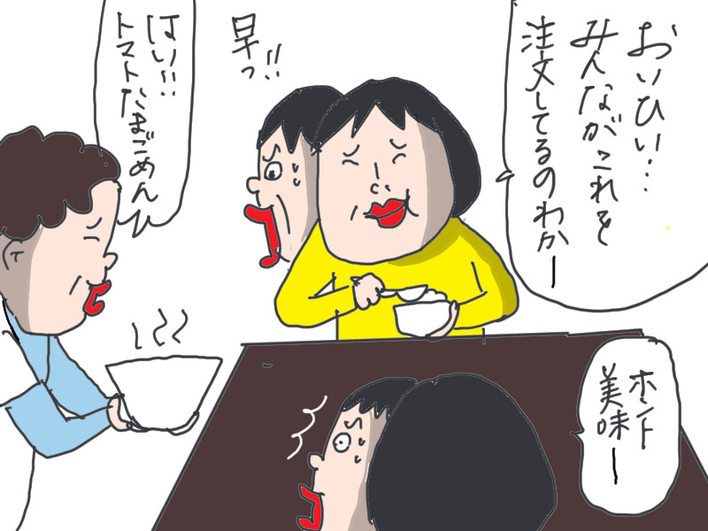 夫にもチャーハンとトマトたまごめんを食べさせてあげたいと思った。しかし、メニューには、トマトたまごめんは平日限定と書いてあった。夫に言ったわ。「有給取る価値あると思うよ!」