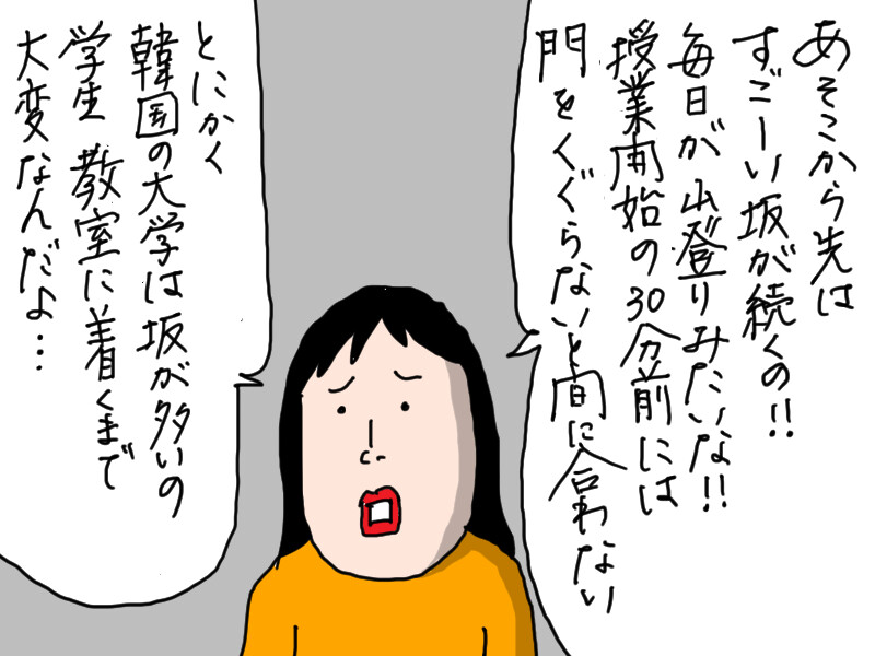 確かに、ソウルの大学は坂です。というよりソウル市内が坂の街です。だから靴屋が多いとも言われてます。
