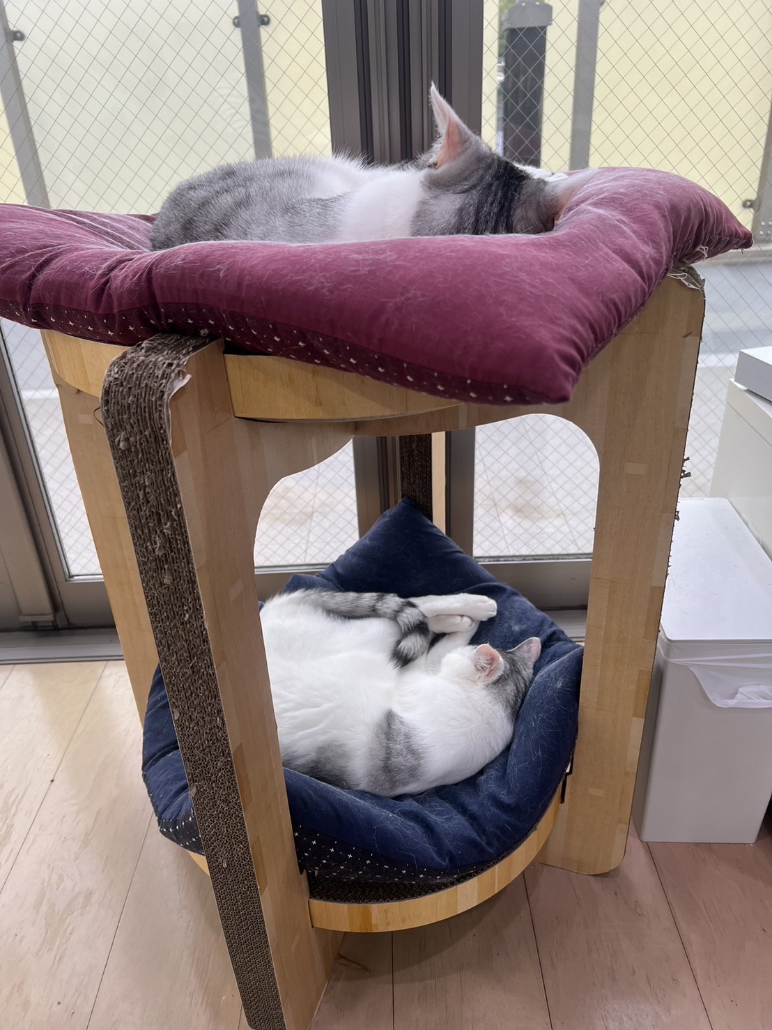 先日掃除の時にこれまたまめちゃんの記事で見たドーナツ型のふわふわベッドをちょっとバリバリボウル上に置いたら、すぐに入る入る🤣ふわふわベッドも飽きてたくせに。うちも2匹なので結局2段とも爪研ぎではなくベッドとして愛用してます。