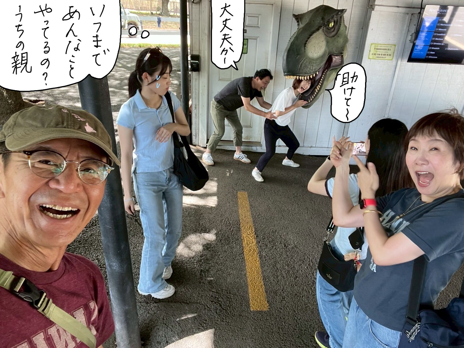 そのあと、恐竜に食べられているカータンを助けようとしているご主人の姿に