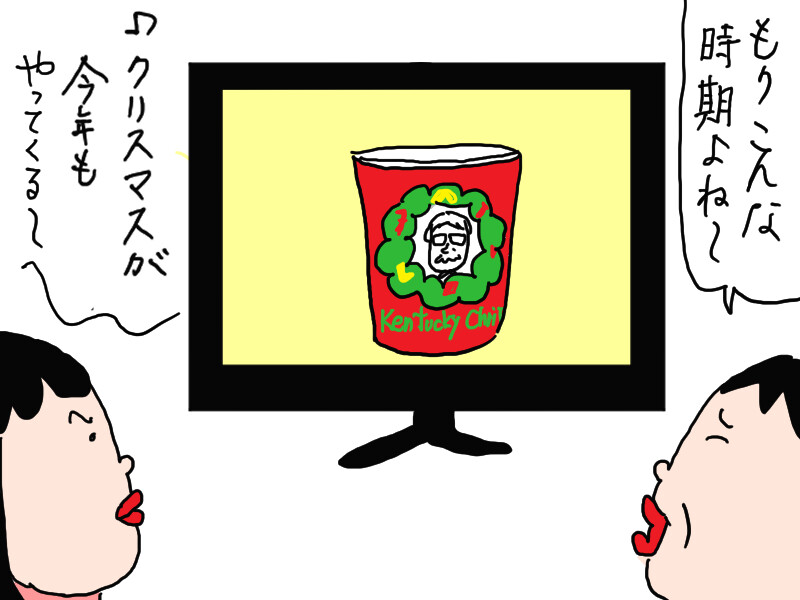 店頭のクリスマスシーズンのサンタ衣装に包まれたカーネルさん、日本にすっかりなじんだケンタ、コマーシャル、味