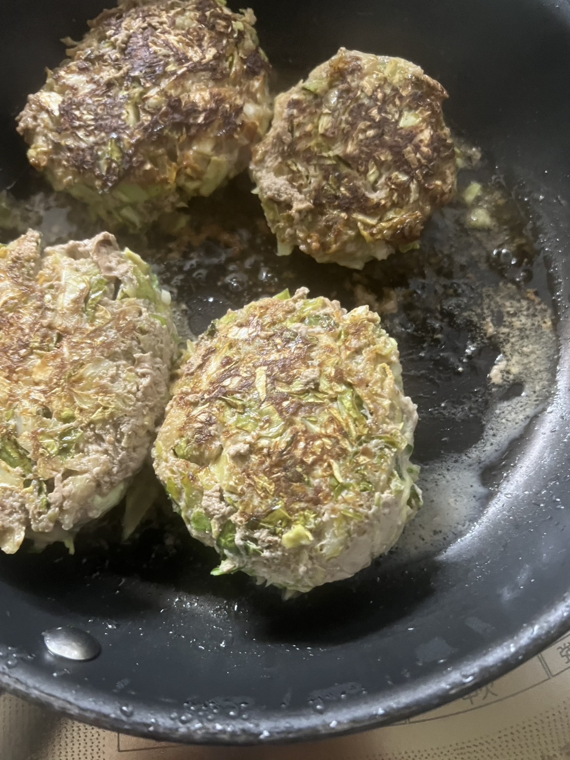 かな姐さんのレシピでキャベツ1玉でこねましたがぜんぜんまとまらず卵を4個増やしたり…焼いたら崩れました。が、味は本当に美味しかったのでもう一度挑戦してみようと思います!キャベツ苦手な夫がたくさん食べてくれました。