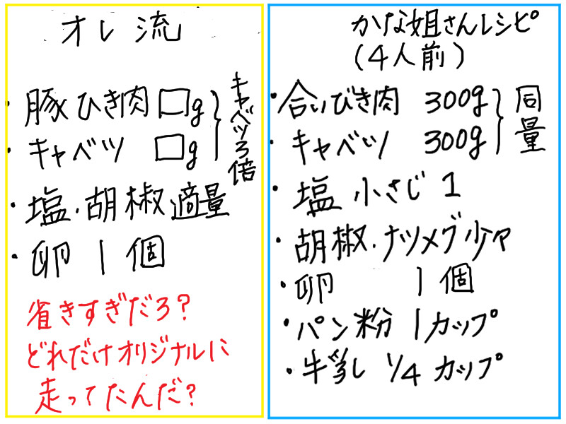 何と!私もいつの間にか省略してました、パン粉と牛乳を入れてなかった…カータンすごいわ、キャベツ3倍までいけるのね、私も頑張ってみる