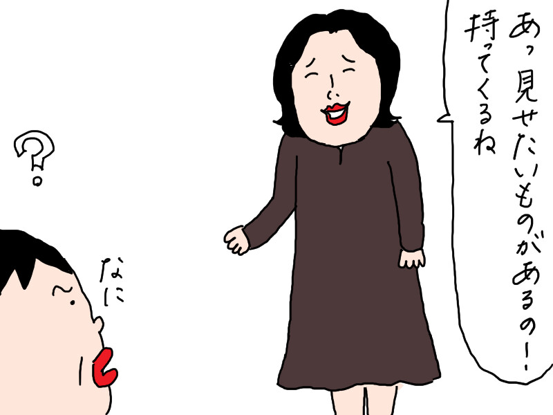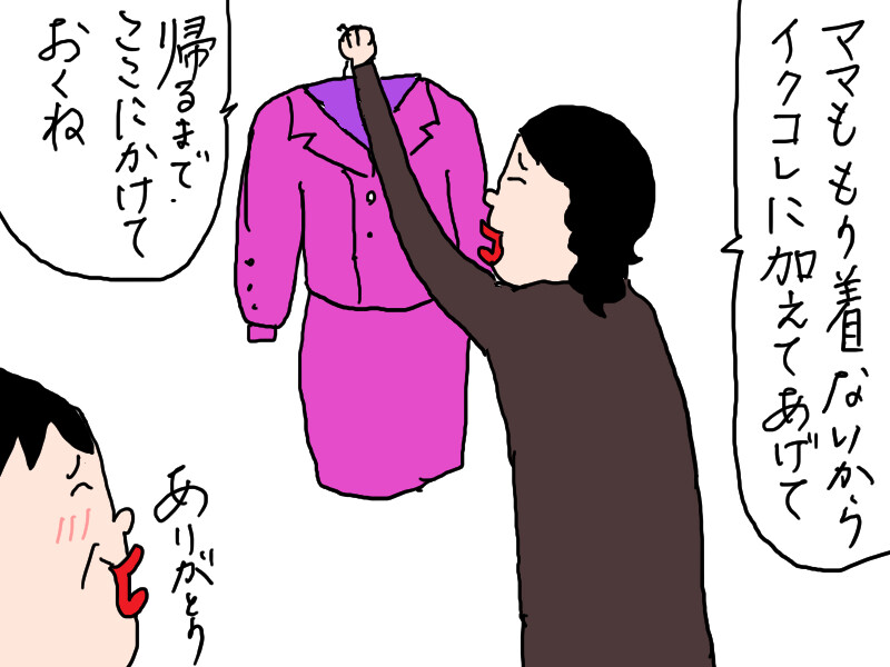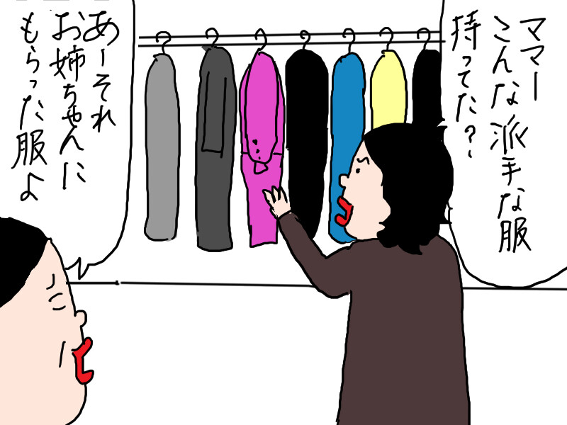 母の服を見て、驚いている。