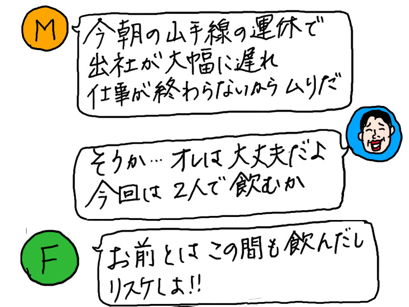 3人のグループLINEで、1人の都合が悪くなった場合、「じゃあ、2人で飲み会決行!!」っていうのも気が引けますしね。気の置けないメンバーなら人数の多い方が楽しいですよ!次はいつですか?笑