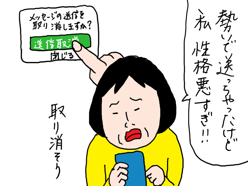 勢いで送ったLINEになかなか既読がつかなかったり、返事が来ないと、あっ、私、まずいこと言った?と自己嫌悪に陥って、送信取り消し。で、マリリンに「何送ってきたの?」と言われ。「いやー性格悪いと思われそうで」と弁解すると「そんなのとっくにわかってるわ!」と。
